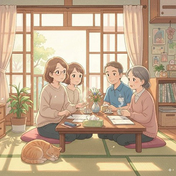 サービス担当者会議とは、ご本人・ご家族のほか、ケアに関わる専門職が集まる会議で、ご本人の支援について、 目標や役割分担などを検討、共有をします。